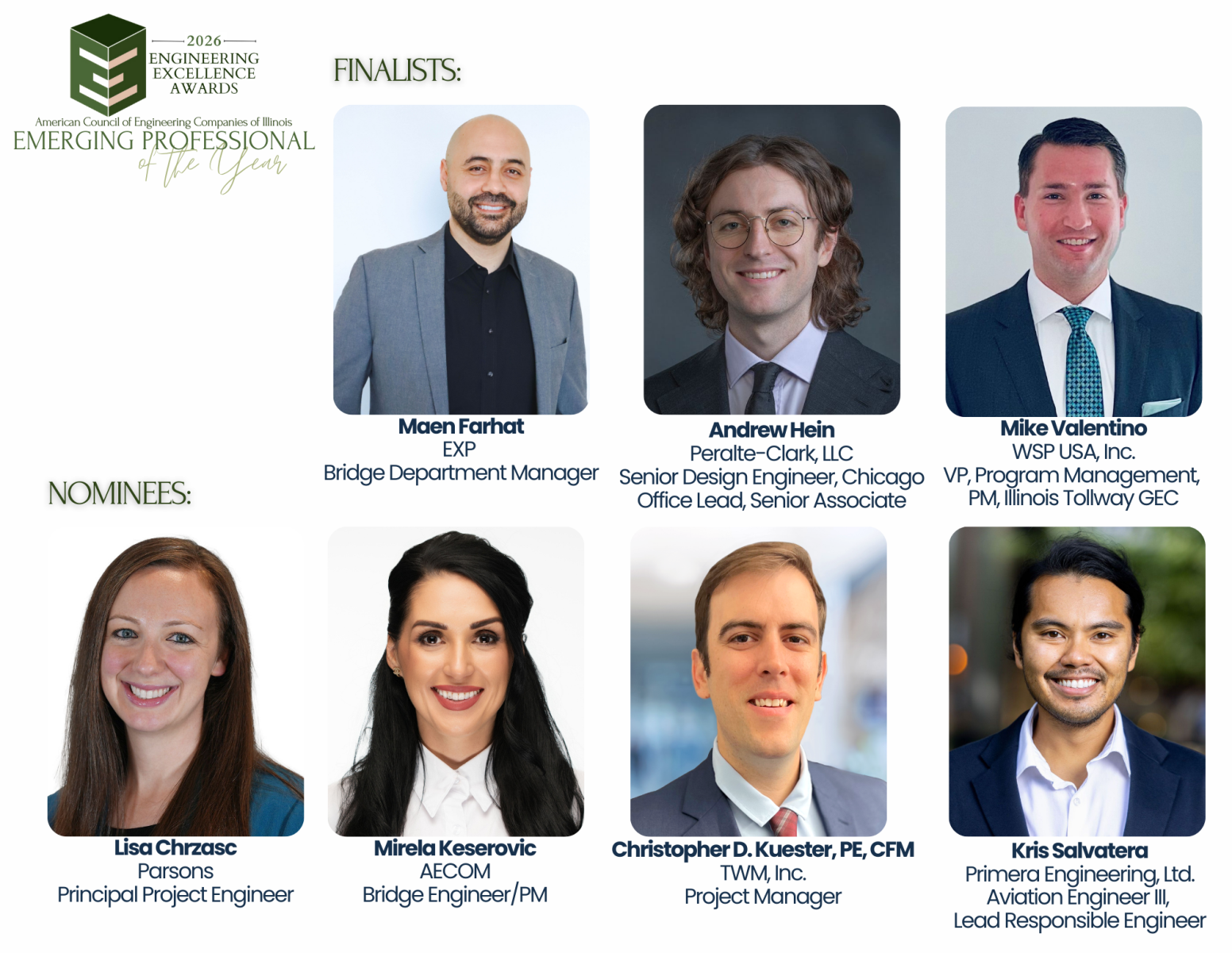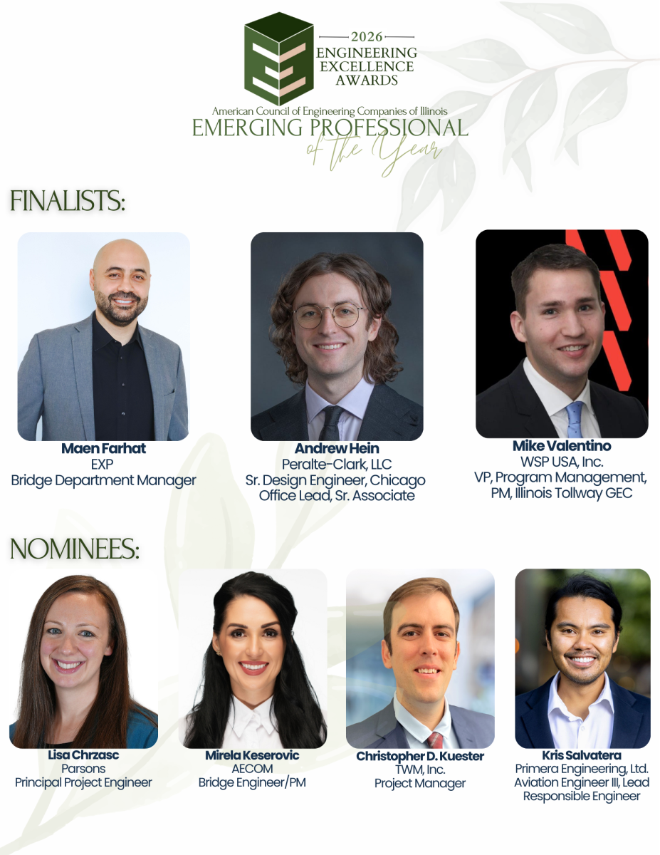 The Emerging Professional of the Year Award recognizes the accomplishments of our emerging professionals who have contributed to the engineering profession, ACEC Illinois and impacted society.