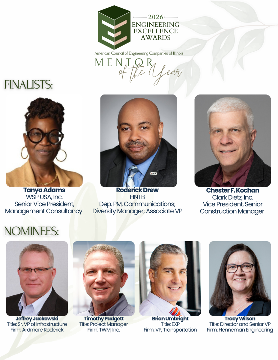 Started in 2022, ACEC Illinois created an award that focused on highlighting mentors across the industry. This award is created through nominations, submitted to a judging panel, and then highlighted at the Engineering Excellence Awards Gala. We value those individuals that take time to invest in others, inside and outside their own firm, with the goal of enhancing the engineering industry.